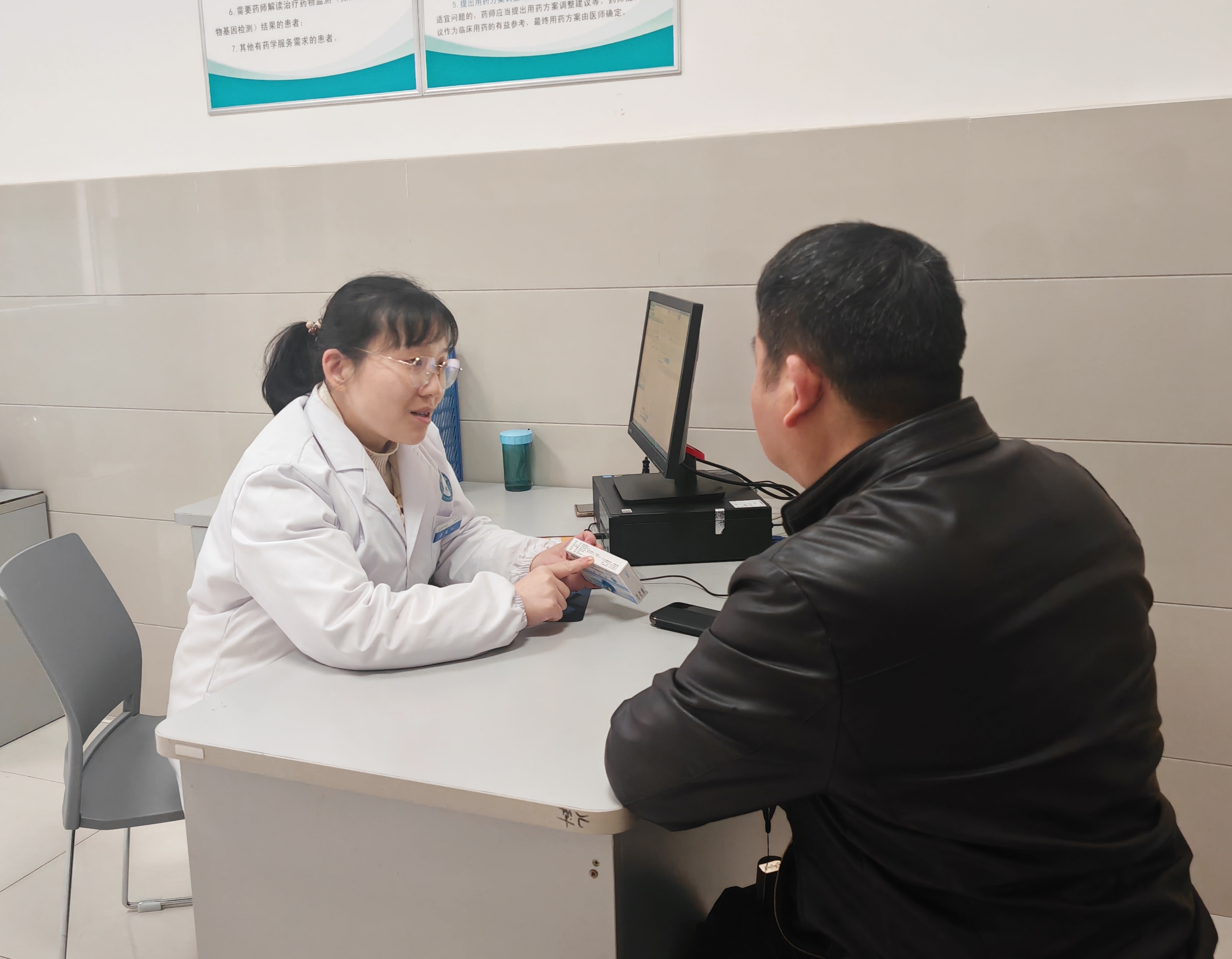 迁至新址后的药学门诊实行严格的“一医一患一诊室”制度。明亮整洁的独立空间,让患者能从“站着匆匆问”转变为“坐下来慢慢聊”。无论是慢性病复杂的用药方案,还是特殊体质患者的用药顾虑,药师都能在不受打扰的环境下,静下心来为患者“把脉”药方。
